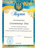 Вихованки гуртка "Петриківський розпис", керівник Головко М.М.прийняли участь у міському конкурсі "Новомосковськ творчий". У номінації "Краща саморобка" на тему "Я люблю рідне місто" Нікітіна Анастасія посіла ІІІ місце. Соломоненко Діна отримала подяку за участь уконкурсі.